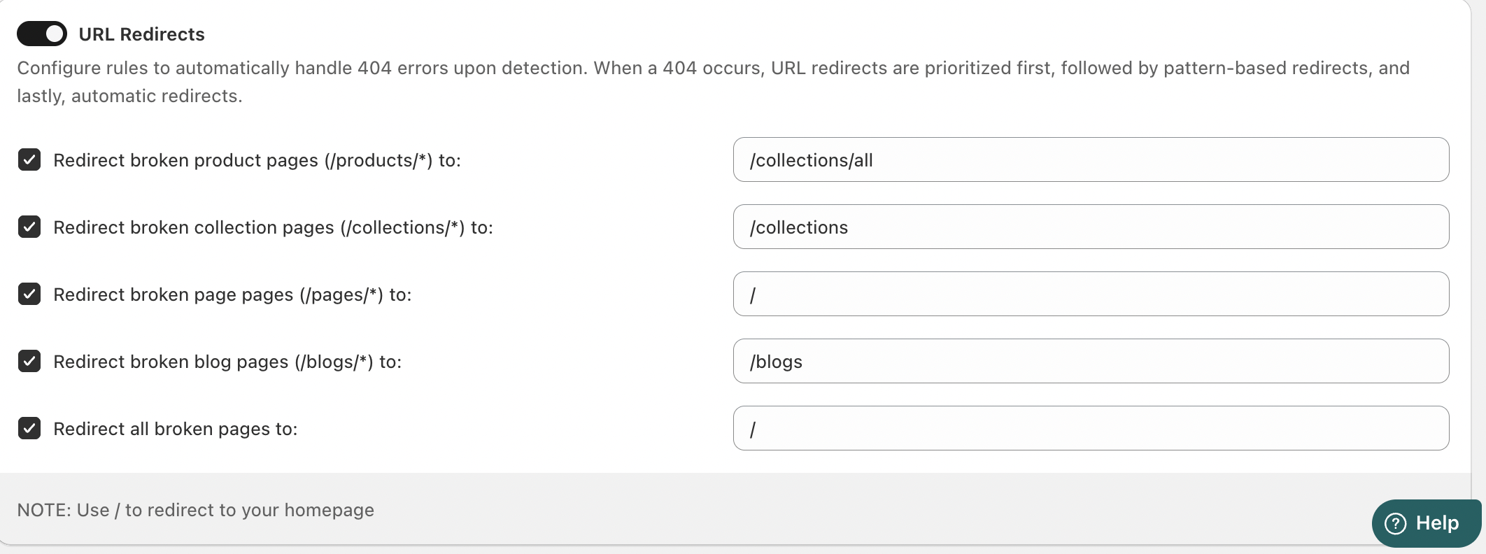 Use the URL Redirects toggle to activate or disable the redirect rules.