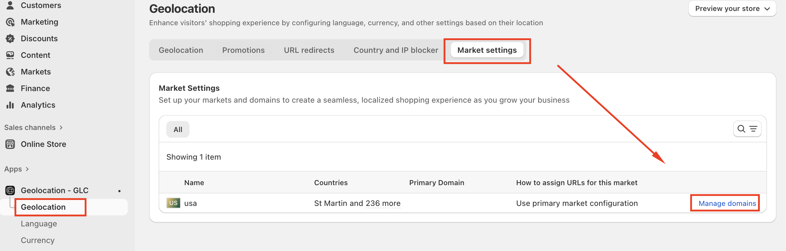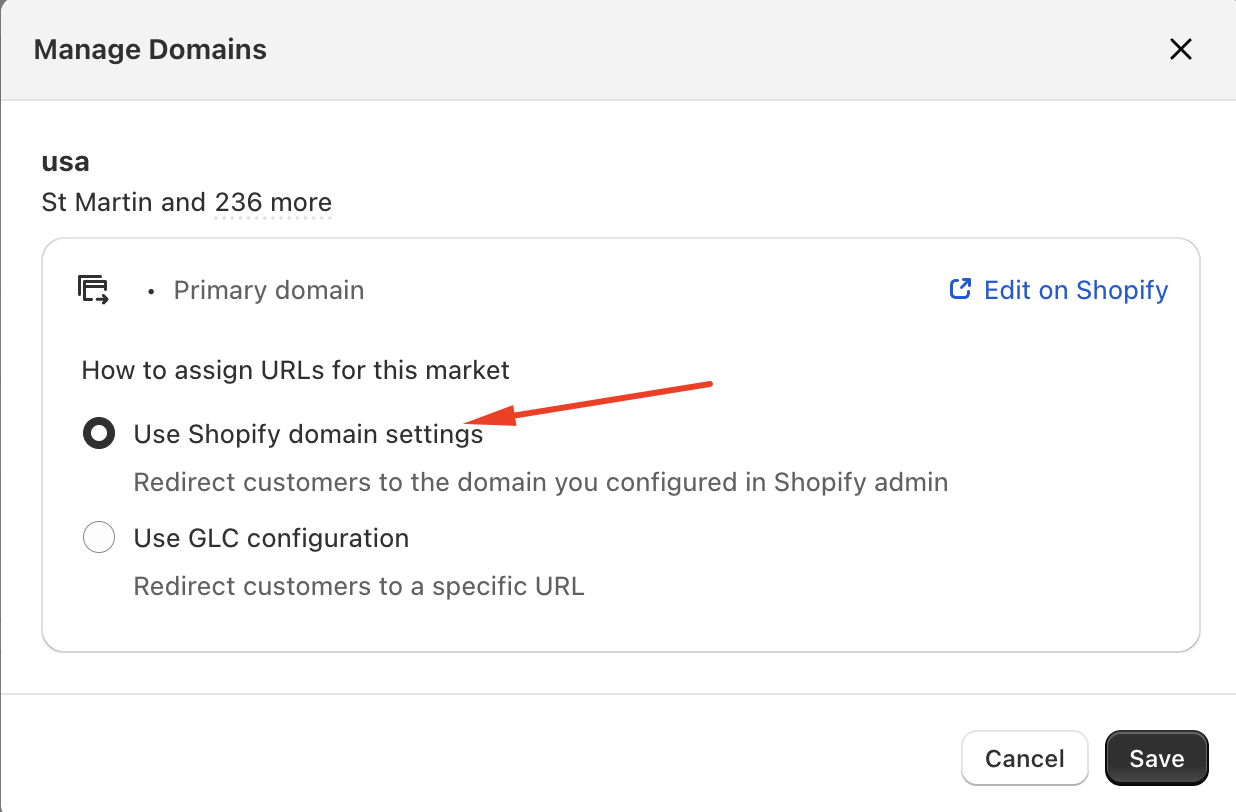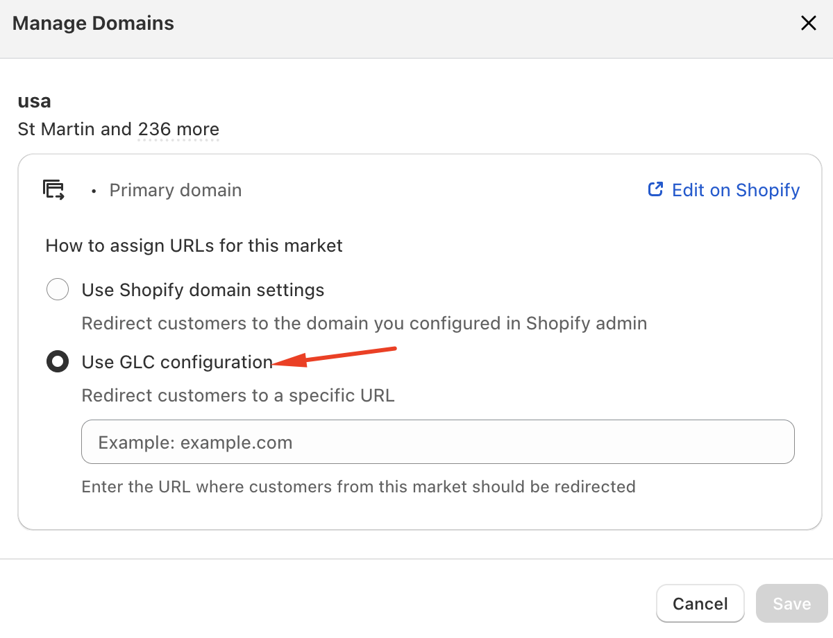 You can choose to follow Shopify’s native domain configuration or define custom redirect URLs using Geolocation – GLC.