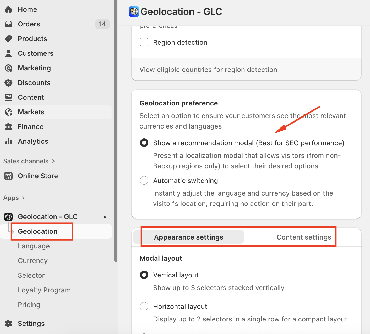 The Geolocation Modal in GLC allows you to recommend or apply the most relevant shipping country, language, and currency for visitors based on their location. Using Appearance settings and Content settings, you can fully customize how the modal looks and what it says to match your brand and customer experience.