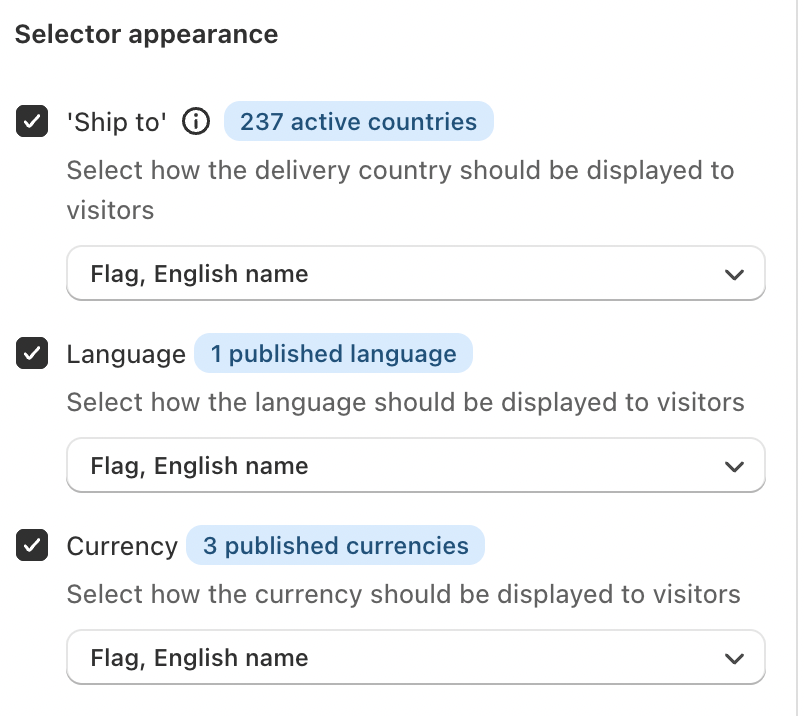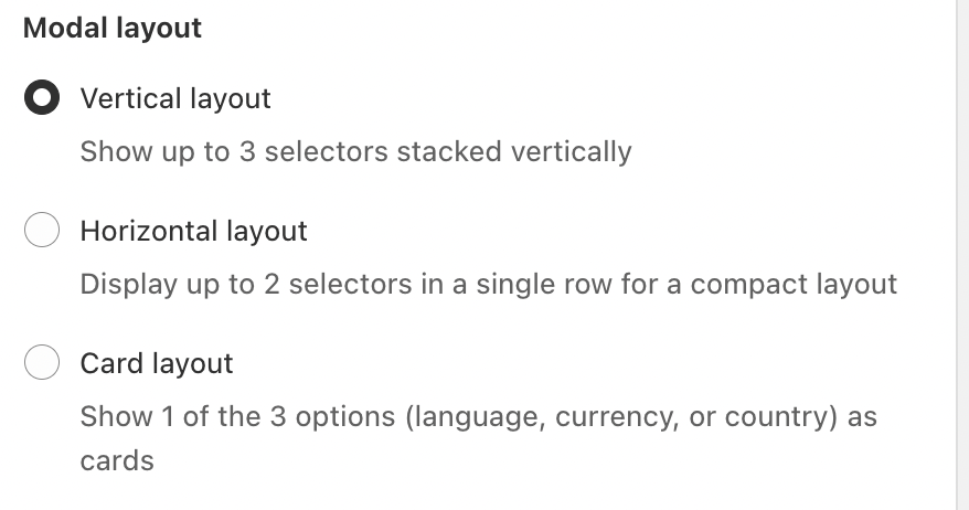 Choose how selectors (country, language, currency) are arranged inside the modal: