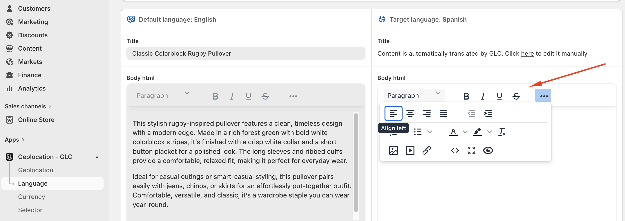 Basically, Geolocation-GLC will rely on the default store content to translate into other target languages, so the translated text will be reflected on the same font and format of the default store content.