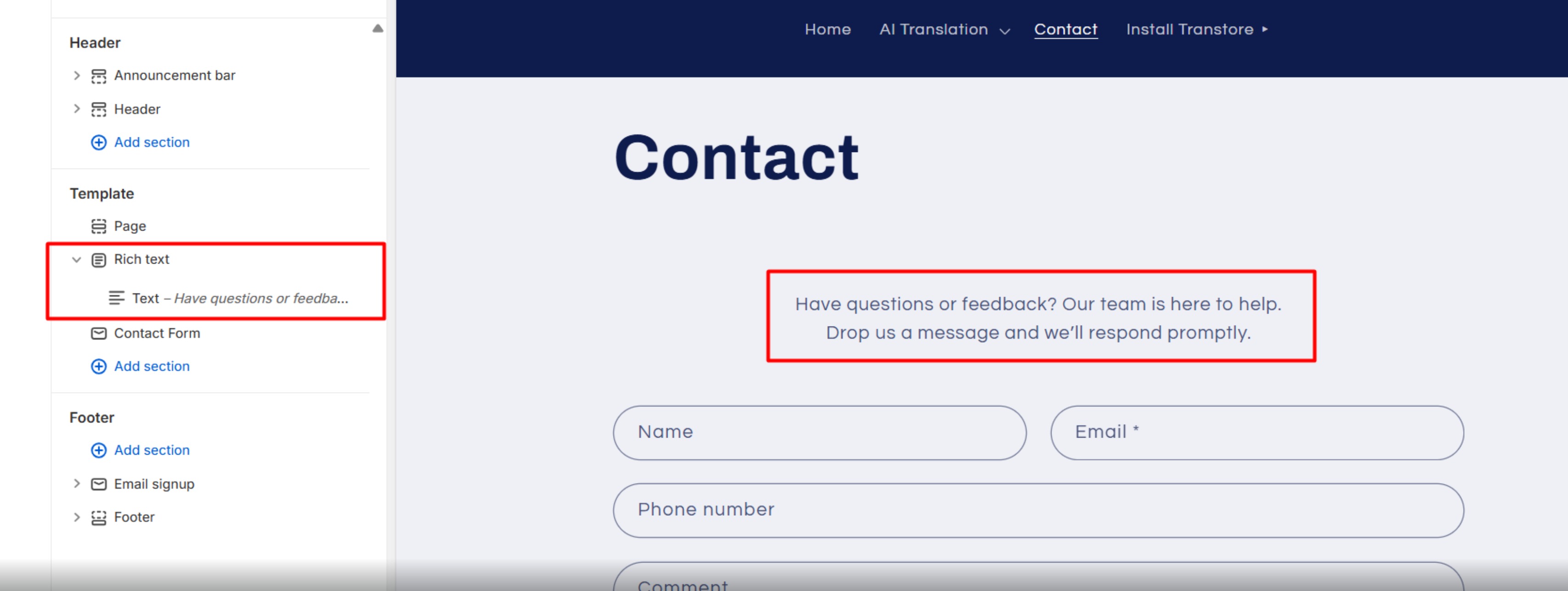 If you want to edit texts built with Rich Text in your theme, you need to do it inside our app under: Translations → Theme → Templates