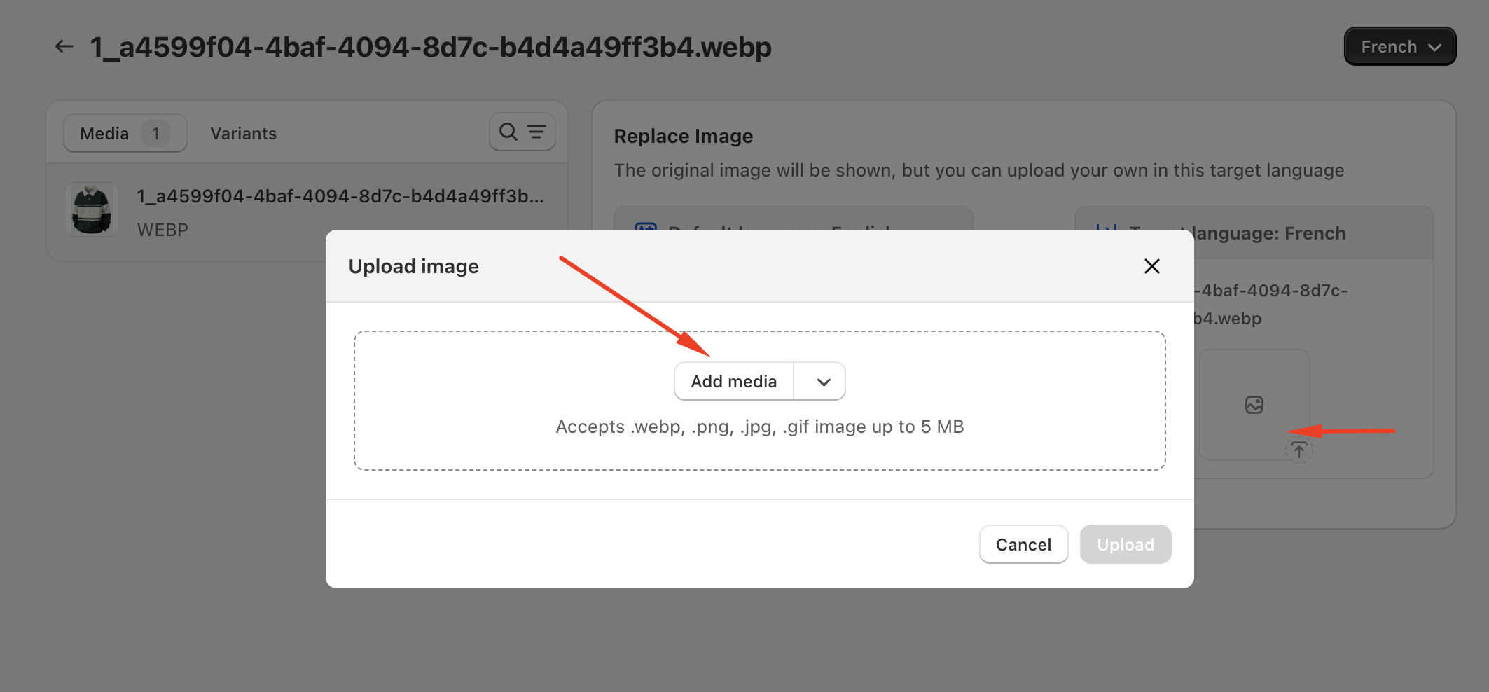 The image is automatically saved after you upload it. You can double-check how it displays on the storefront by switching to the target language.