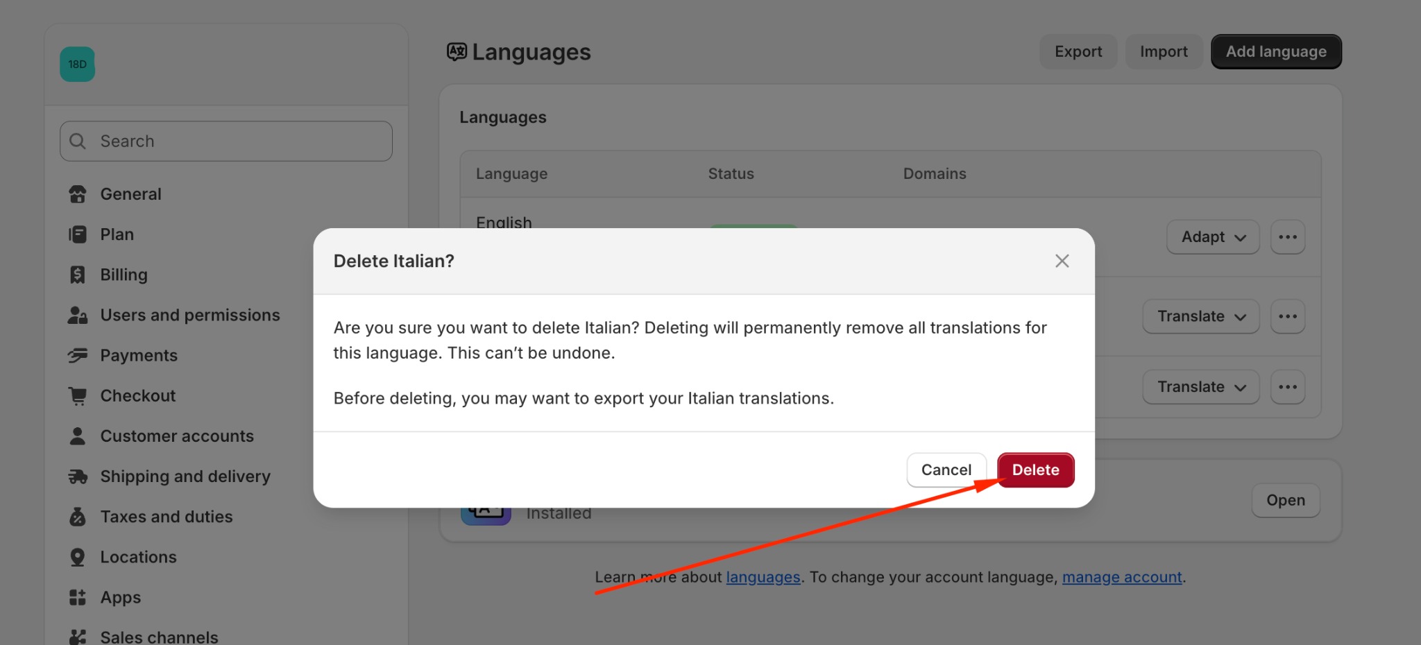 If you don’t want to use the existing translations and prefer to start fresh with Gelacy, you can delete that language completely from Shopify. This will permanently remove those translations from Shopify’s system.