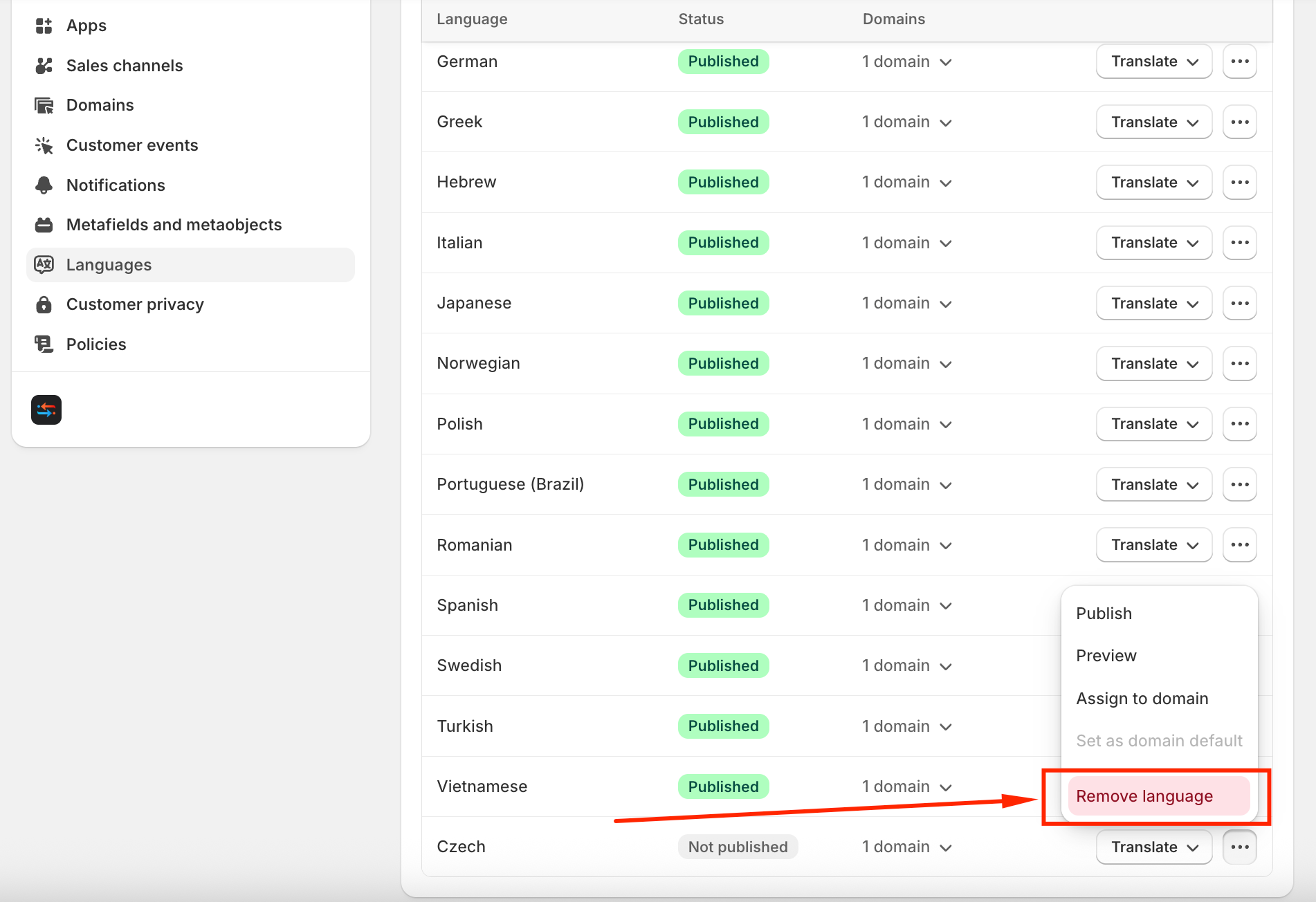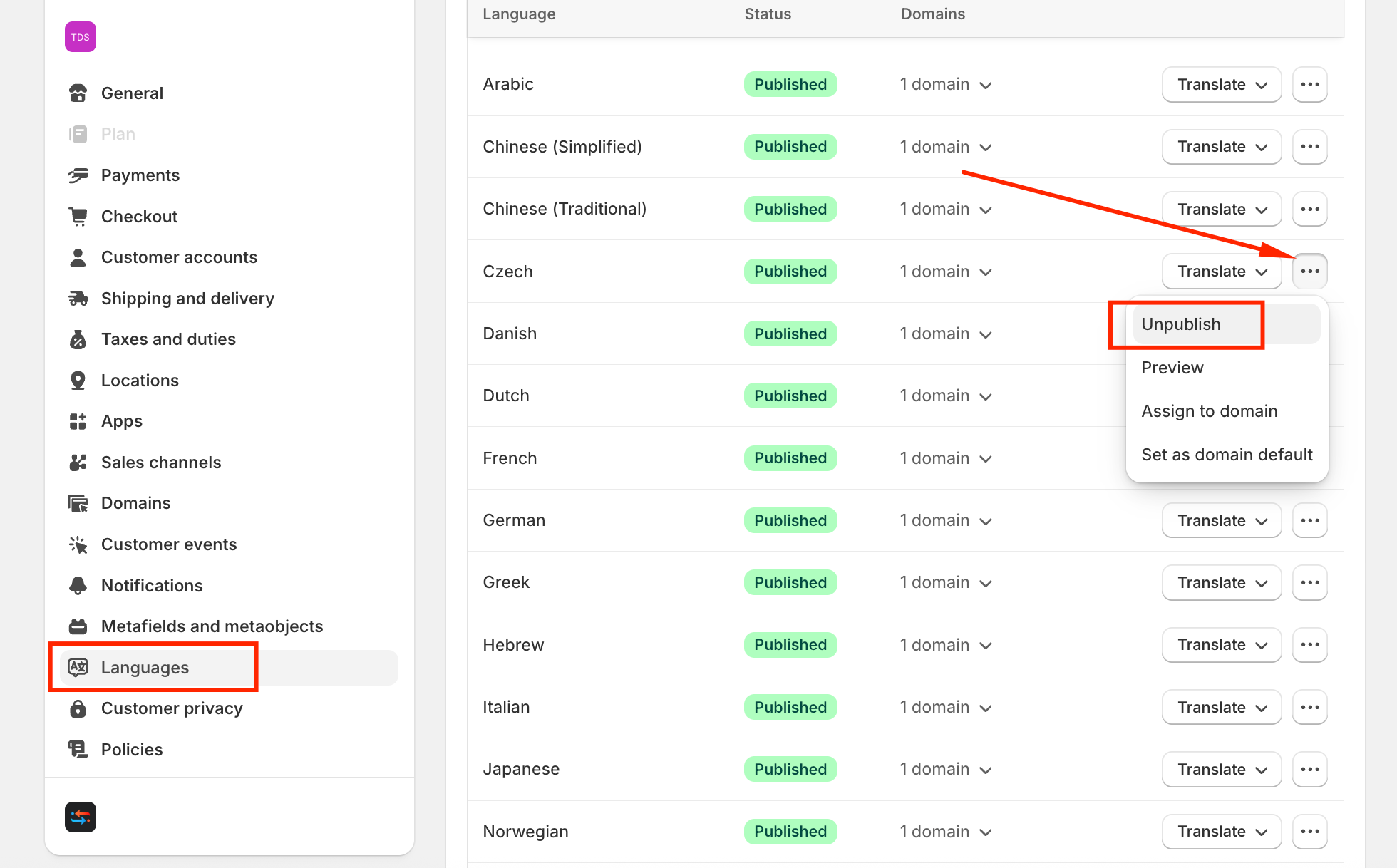 (1) Go to Shopify Admin → Settings → Languages → Unpublish the Language you want: