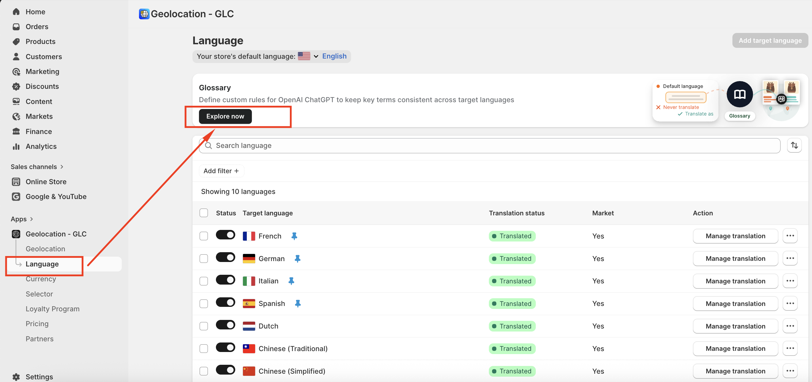 The Glossary feature helps you define and manage key terms, brand vocabulary, and specialized phrases so that they are translated consistently and correctly across all languages in your store.