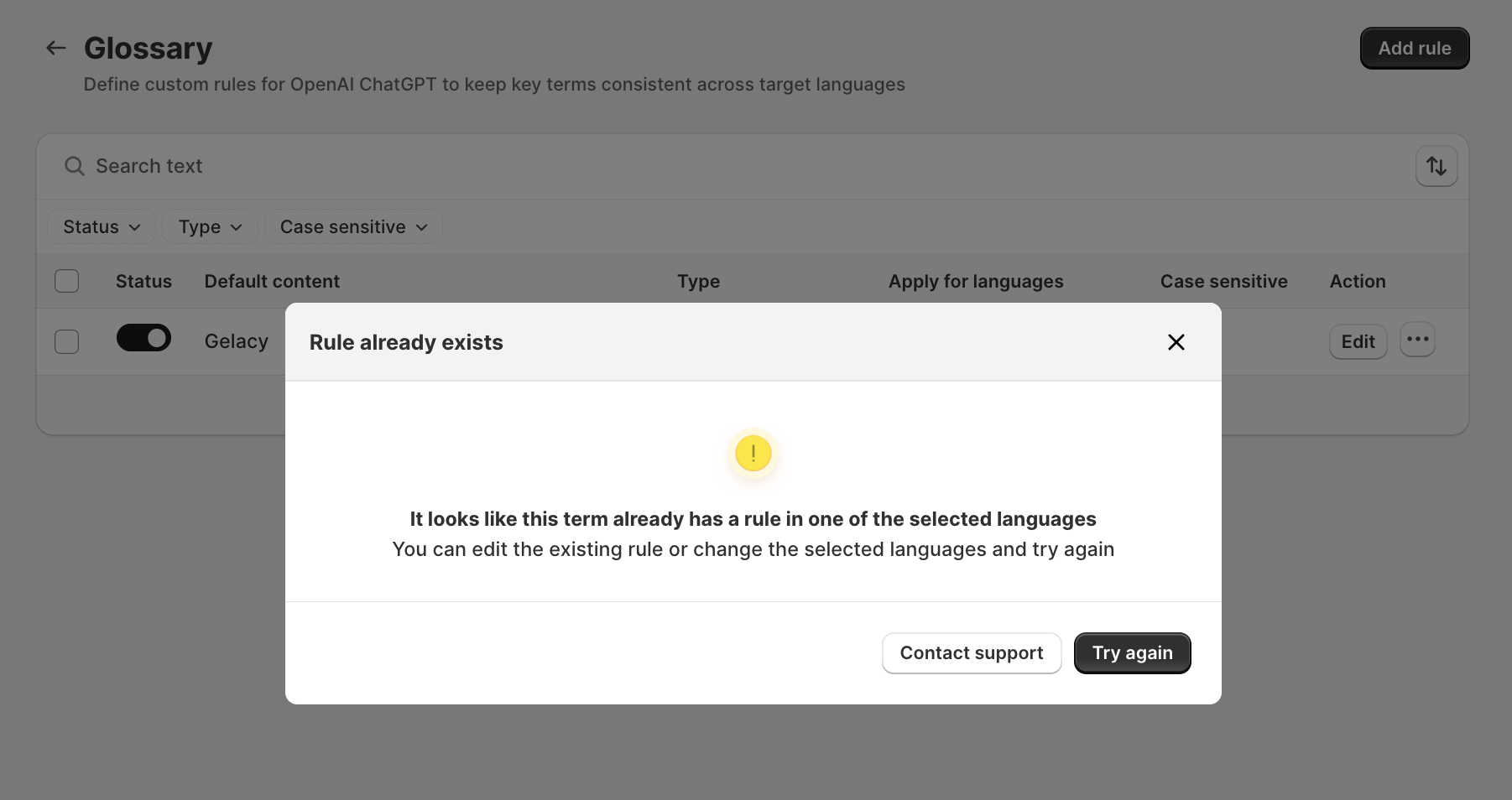 With Gelacy’s new Glossary feature, you can define how specific terms should be translated—or untranslated on the storefront. Perfect for brand names, product terms, and industry-specific words that must stay consistent across all languages.