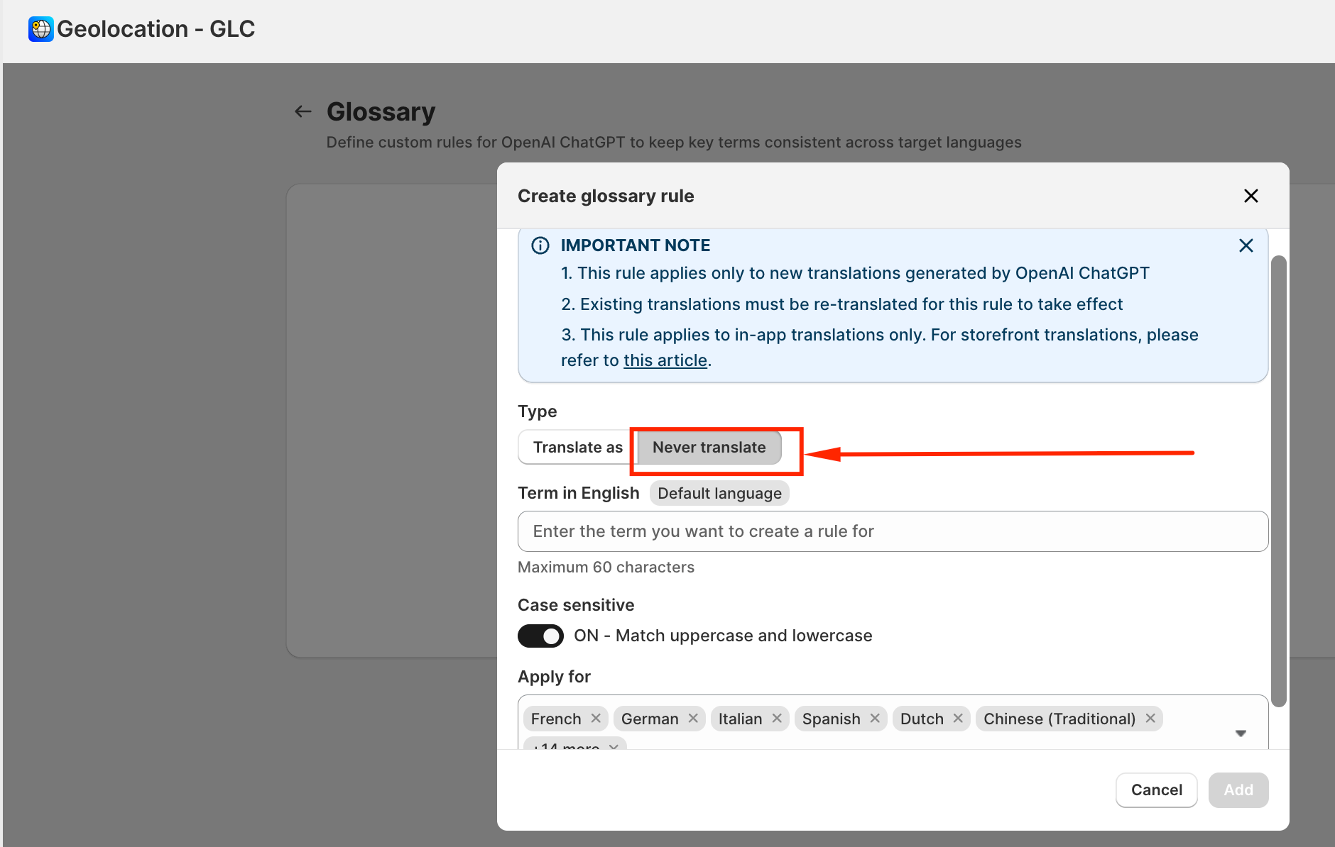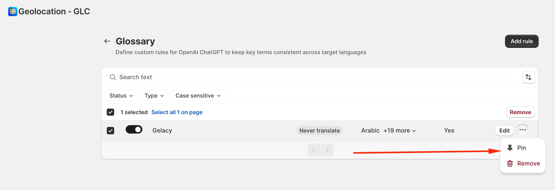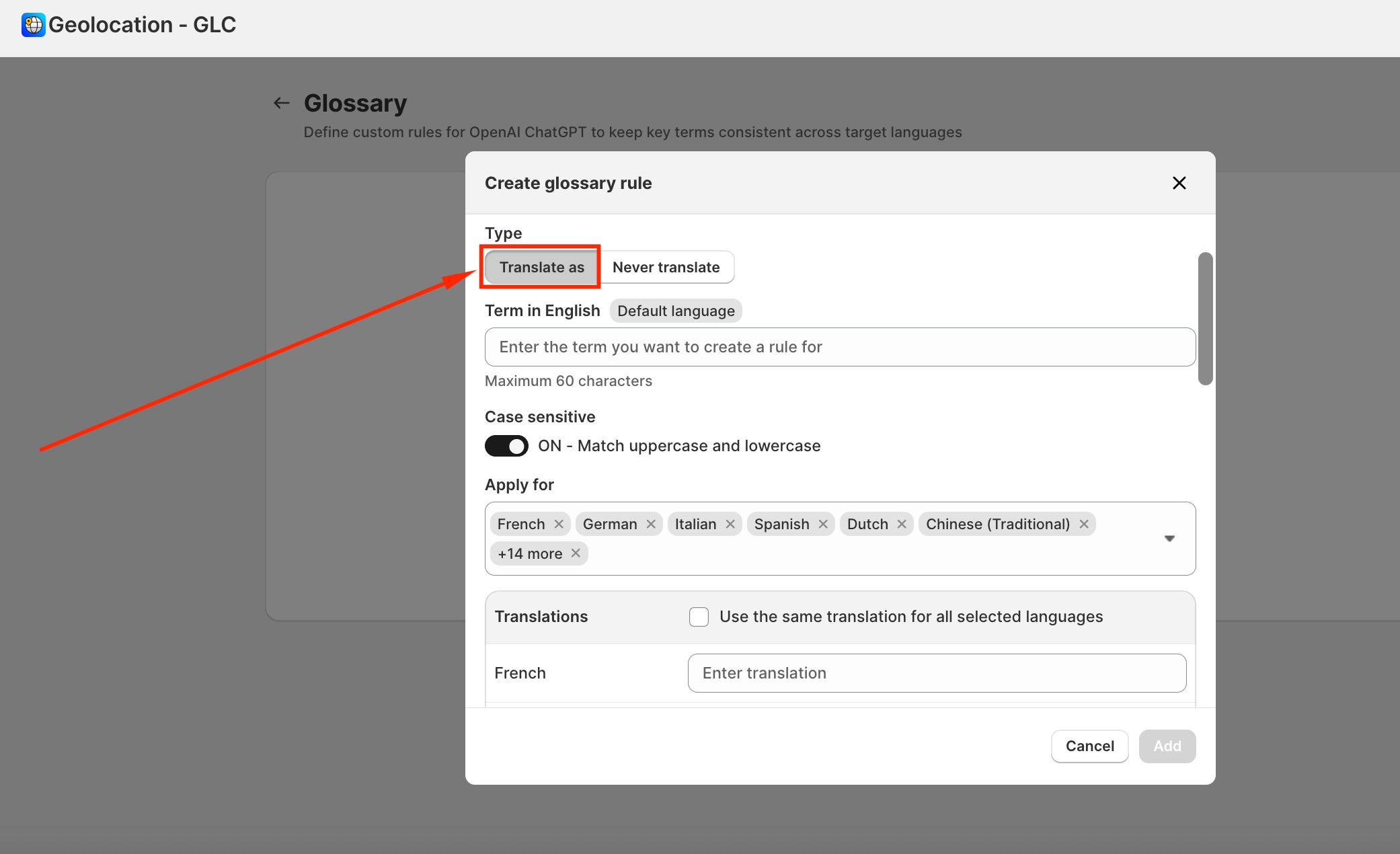 Click Add rule to open the rule setup window. Gelacy supports 2 rule types: Translate as or Never translate.